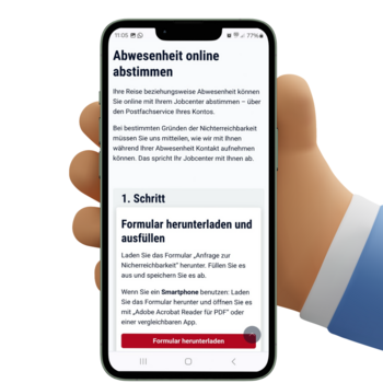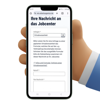 Wählen Sie das Anliegen „Ortsabwesenheit“, füllen das zum Download angebotene Formular aus und schicken dieses dann als Anhang der Nachricht an das Jobcenter.