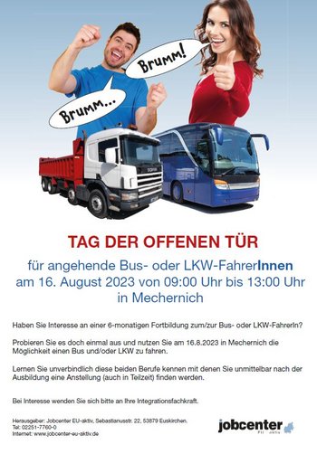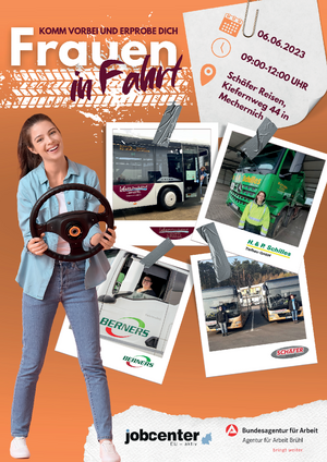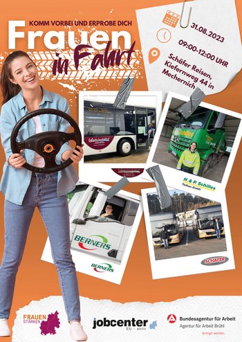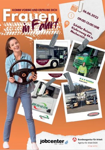 Am 06.06.2023 laden die Beauftragten für Chancengleichheit am Arbeitsmarkt, Sandra Schmitz (Agentur für Arbeit Brühl) und Ingrid Kloß (Jobcenter EU-aktiv) Frauen von 9 Uhr bis 12 Uhr zu einer Probefahrt mit einem LKW und/oder einem Bus ein. Auch einen Bagger können Sie steuern und den extra für die Aktion angefahrenen Sand „wegschaufeln“.