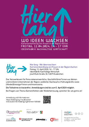 (Die Veranstaltungen werden organisiert von: Agentur für Arbeit Brühl, Jobcenter EU-aktiv, Wirtschaftsförderung Kreis Euskirchen, Kompetenzzentrum Frau und Beruf Region Aachen)