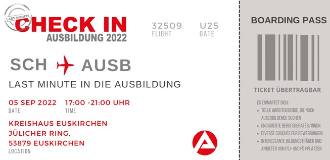 Du willst noch in diesem Jahr eine Ausbildung beginnen? Du möchtest jetzt noch durchstarten und deinen beruflichen Karriereweg sofort beginnen? Wir bieten Dir am 05.09.2022 eine „First Class“ Möglichkeit dazu. Komm zu unserer LAST MINUTE Ausbildungsmesse „CHECK IN – Ausbildung 2022“!