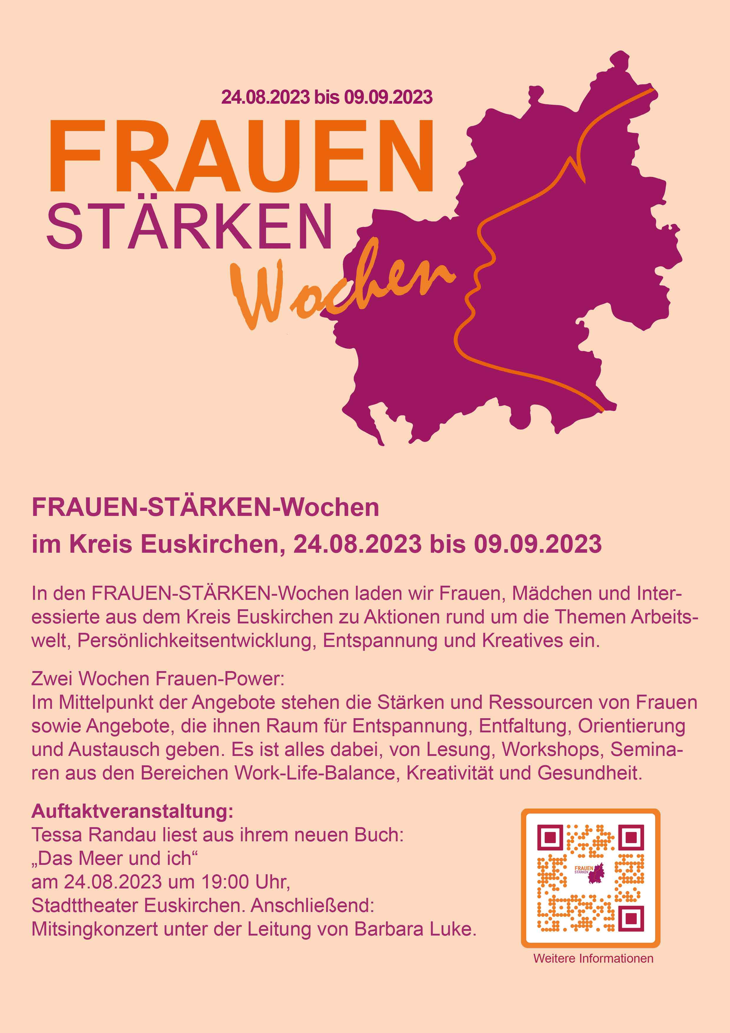 In den FRAUEN-STÄRKEN-Wochen laden wir Frauen, Mädchen und Interessierte aus dem Kreis Euskirchen zu Aktionen rund um die Themen Arbeitswelt, Persönlichkeitsentwicklung, Entspannung und Kreatives ein. Zwei Wochen Frauen-Power gab es noch nie in Euskirchen: